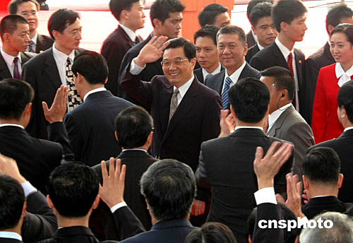 中共中央總書記、國家主席、中央軍委主席胡錦濤,十九日下午在澳門西灣大橋落成典禮儀式上,向參加儀式的澳門各界人士招手致意。