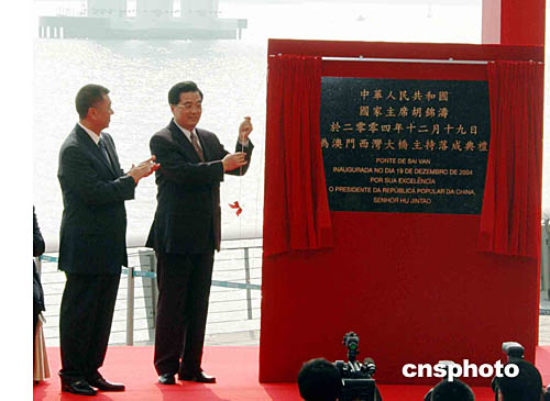 在何厚鏵的陪同下,胡錦濤主席首先為西灣大橋紀(jì)念牌匾揭幕。在一片掌聲中,胡錦濤主席徐徐拉開了遮蓋在牌匾前的紅色帷幕,只見牌匾上書“中華人民共和國(guó)國(guó)家主席胡錦濤于二00四年十二月十九日為澳門西灣大橋主持落成典禮”。