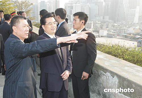 胡錦濤主席在澳門大炮臺參觀時,行政長官何厚鏵向其介紹澳門市政建設情況。