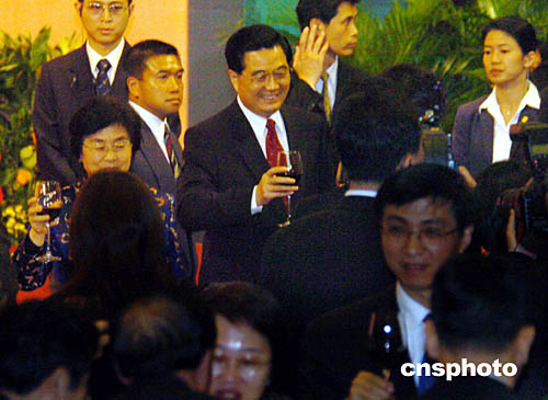 晚七時,在澳門警察局銀樂隊奏響的迎賓曲和二百多名各界嘉賓的熱烈掌聲中,胡錦濤主席和夫人劉永清在澳門特區行政長官何厚鏵及夫人劉渭楨的陪同下步入宴會廳。