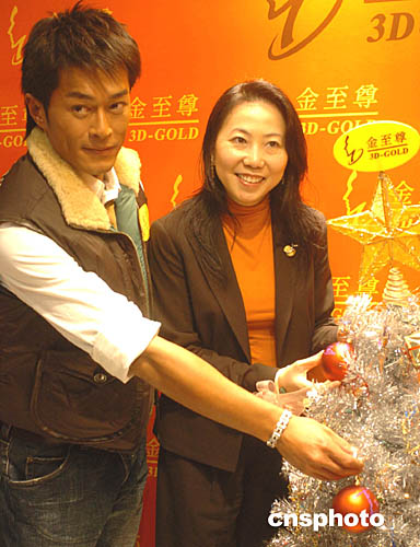 香港影視紅星古天樂(左)23日在香港金至尊主席伍綺媚的陪同下﹐出席銅鑼灣又一新店的開業儀式﹐并許下圣誕愿望掛于樹上﹐求得平安。