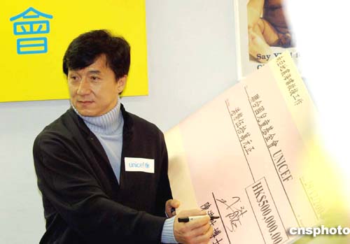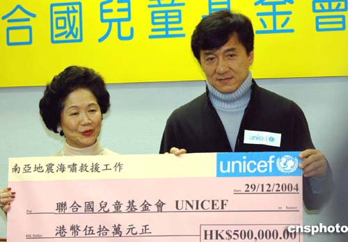 香港多個民間救援機構陸續發起籌款活動,為南亞海嘯災難捐款,12月29日,國際影星成龍在香港認捐五十萬元予聯合國兒童基金會。作者:洪少葵