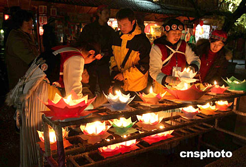 年終歲末,世界文化遺產--云南省麗江古城夜幕降臨后,盛裝的納西族姑娘在穿行古城的清清山泉溪水畔出售色彩各異的河燈,供同胞和游客在清冽的水中放河燈以許下來年美好的心愿。中新社記者:任晨鳴