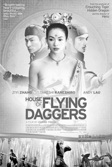《十面埋伏》此次參賽金球獎的電影海報,選用了章子怡的露肩劇照,海報以綠色竹林為背景,暗紅色英文片名格外醒目:House of Flying Daggers(《十面埋伏》)。整個海報與內(nèi)地艷色、明麗的感覺形成鮮明對比,感覺清爽、淡雅。法國影片《漫長的婚禮》則沿用了其國內(nèi)的海報,全用法語進行介紹。