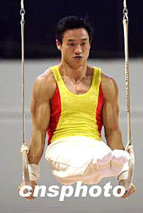 5月14日晚,中國國家體操隊隊員楊威在江蘇蘇州舉行的全國體操錦標賽暨雅典奧運選拔賽資格賽吊環比賽中大顯身手,并以總分57.825分的成績獲得全能冠軍。中新社記者:盛佳鵬