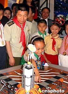 六月一日,一位小航天迷在北京中國兒童中心向航天飛行員楊利偉介紹機器人火星探險車。當天,楊利偉在孩子們的簇擁下出席了以“學習科學文化知識,發展祖國航天事業”為主題的兒童科技活動,與孩子們一起歡度“六一”。中新社記者:王歡