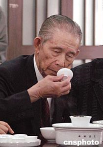 王永慶品嘗家鄉香飄四海的名茶“鐵觀音”。作者:吳躍生