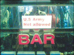 位于漢城市中心娛樂區的禪宗酒吧老板說:“我們掛出美國大兵免進的牌子是因為美國大兵總是打架,偷酒喝,騷擾婦女。”上個月,兩名美國士兵就是在禪宗酒吧喝酒后剌傷了一名韓國的出租車司機的。韓國警察把美軍士兵的行為定性為“酒后滋事”。