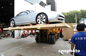 圖為工作人員正忙著將一款東風雪鐵龍新型跑車運進展廳。中新社記者:盛佳鵬