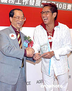 歌星譚詠麟6月9日在香港出席義務工作發展局舉行《全民義工參與賣旗日‧榮譽義工大使委任儀式》,義務工作發展局主席李澤培向譚詠麟致送紀念品。