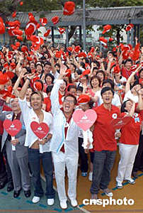 歌星譚詠麟、李克勤、余文樂6月9日在香港出席義務工作發展局舉行《全民義工參與賣旗日‧榮譽義工大使委任儀式》,三位榮譽義工大使聯同上百義工齊聲高呼「凝聚義工力量,發放愛心光芒」口號。