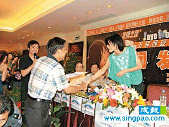 中新網6月18日電 據香港大公報報道,王菲將首次在西安舉行個人演唱會。在記者會上,有十名之前玩游戲勝出的歌迷,可以進入記者會見偶像,期間有一名男士竟寫了一首詩公然向“阿菲”示愛。