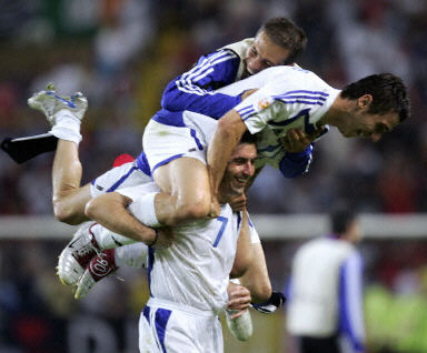 下半時,法國隊加快了進(jìn)攻節(jié)奏,左后衛(wèi)利扎拉祖更是不知疲倦的參與進(jìn)攻。希臘隊場上顯得有些被動,他們換下了一名前鋒,增加一名前衛(wèi),試圖扭轉(zhuǎn)被動局勢。久攻不下的法國隊終于被希臘隊找到了軟肋,第六十五分鐘,希臘隊長扎戈拉基斯右路挑球擺脫了利扎拉祖后傳中,法國隊兩名后衛(wèi)去搶前點,但是球卻落在后點查里斯特亞斯頭上,這名希臘前鋒在無人防守的情況下輕松將球頂入了法國隊的大門,希臘隊出人意料的一球領(lǐng)先。