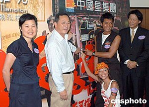 港產電影《柔道龍虎榜》兩位男女主角古天樂、應釆兒及導演杜琪峰7月7日在香港出席樓盤長旺雅苑「電影預展中心」揭幕儀式,并主持亮燈儀式。作者:鄧慶樂