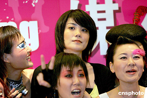 七月二十六日,剛剛獲得CCTV-MTV音樂盛典頒發的“亞洲地區最受歡迎杰出歌手獎”的王菲回到北京宣布,其個人演唱會將于八月二十八日在能容納六萬余人的工人體育場舉行。圖為扮演王菲各個時期造型的歌迷與王菲合影。作者:高遠