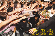 中新網7月27日電 據香港文匯報報道,劉德華昨早飛往日本為《十面埋伏》展開宣傳,雖然他乘坐的班機要到下午四時半才抵達日本機場,但其三百名歌影迷卻早在下午一時已到機場等候偶像。而機場方面的保安,見到如此多Fans也被嚇著,當知道是華仔即將到達時,立即加派十五名保安,并架起圍欄限制歌迷等候的位置,以免造成混亂。