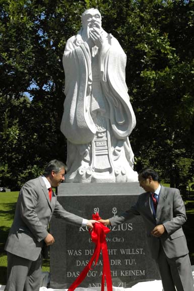 據大公網報道,這尊孔子雕像高2.5米,由細質白麻花崗巖雕刻而成,基座上刻著“己所不欲,勿施于人”的孔子名言。它是中國國務院新聞辦贈送給柏林市的禮物。
