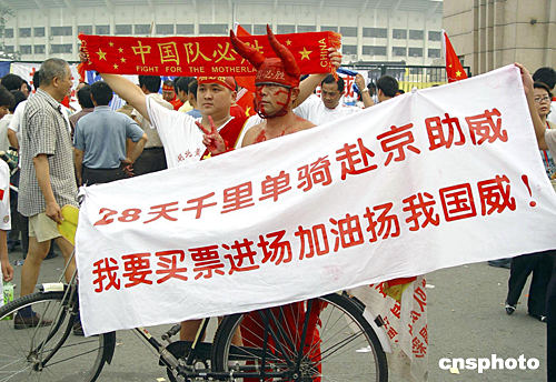 走在沮喪球迷的隊伍中,心情難免不好。這時從對面跌跌撞撞地走來一位年輕的中國球迷,用沙啞的嗓音不停地唱著《歌唱祖國》。看得出,也許是失敗的打擊太大,他已經(jīng)有些神志不清了,身邊的女友眼含淚水,默默地陪在他身邊。許多經(jīng)過的女球迷也已經(jīng)眼眶濕潤。
