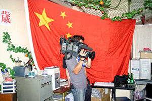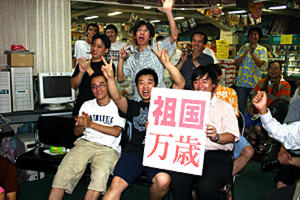 這次活動(dòng)是由大阪的中文報(bào)紙《關(guān)西華文時(shí)報(bào)》策劃組織的,地點(diǎn)在市中心的中華城,數(shù)十名中國人球迷在鮮艷的五星紅旗下,高舉“祖國萬歲”的標(biāo)語牌,邊觀看大屏幕電視,邊為中國隊(duì)吶喊助威的。日本有名的電視臺(tái)每日電視臺(tái)專門派出了一個(gè)攝制小組進(jìn)行現(xiàn)場采訪。