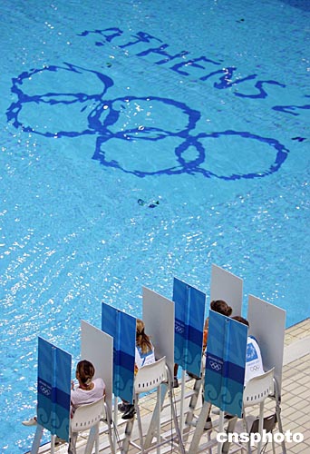 雅典奧運跳水比賽館當地時間八月十二日試驗電子打分系統,裁判當場打分時將用擋板隔開進行獨立操作。中新社記者:毛建軍