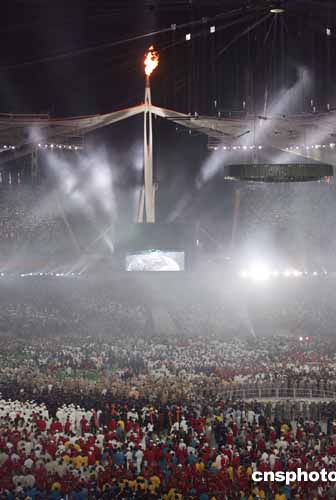 首次實現了真正意義上的全球傳遞的奧運圣火被傳遞到最后一名火炬手——希臘帆船世界冠軍科納馬納斯基手中,他用手中的小火炬點燃了紡錘形的主火炬,火炬臺慢慢回立至高空,奧運圣火在奧林匹克發源地熊熊燃起,光耀全球。