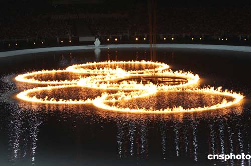 當地時間八月十三日晚,第二十八屆奧運會在希臘雅典開幕。圖為開幕式上奧運五環標志從“愛琴海”中升起。中新社記者:毛建軍