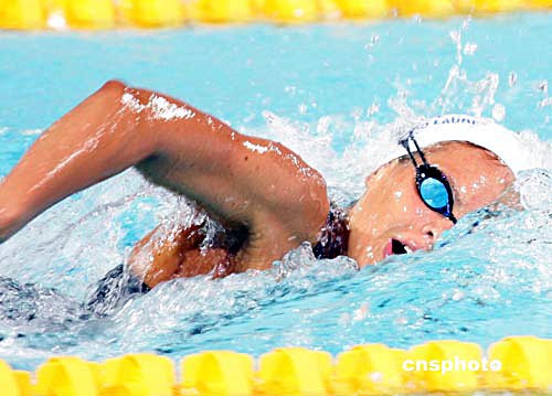當地時間八月十五日晚,在雅典舉行的第二十八屆奧運會游泳比賽中,法國選手MANAUDOU LAURE以四分零五秒三四的成績獲得女子四百米自由泳金牌。中新社記者:毛建軍