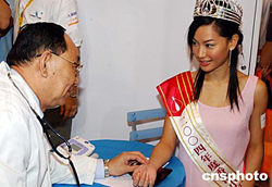 2004年度香港小姐冠軍徐子珊、亞軍朱慧敏、季軍符思思,八月十六日參加在香港會(huì)展中心舉行的美食博覽展,為一家制藥商造勢。中新社記者:錢興強(qiáng)