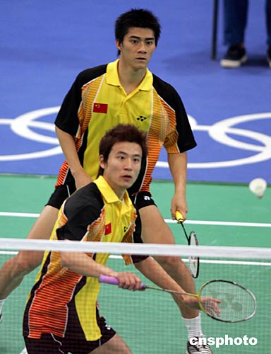 當(dāng)?shù)貢r(shí)間八月十六日,參加雅典奧運(yùn)會(huì)男子羽毛球雙打比賽的中國(guó)選手蔡赟、付海峰,以2:1戰(zhàn)勝日本選手,與另一對(duì)中國(guó)選手?jǐn)y手進(jìn)入前八名。中新社記者:任晨鳴