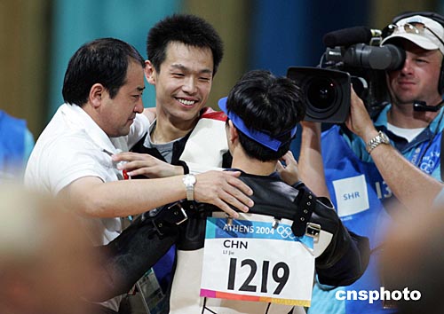 當地時間八月十六日,中國選手朱啟南(左)與李杰在雅典奧運男子十米氣步槍射擊比賽中分獲金、銀牌。朱啟南并以七百零二環的成績打破世界紀錄。中新社記者:毛建軍