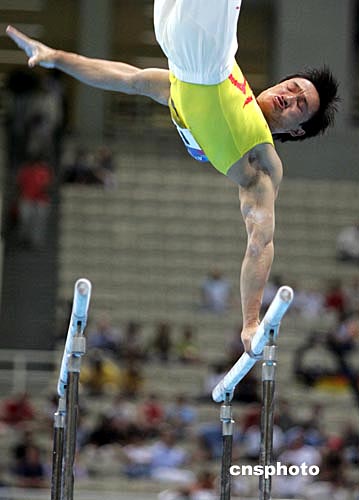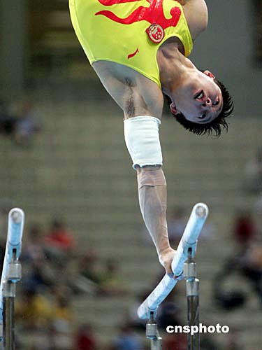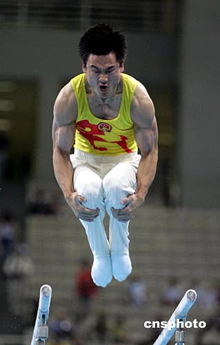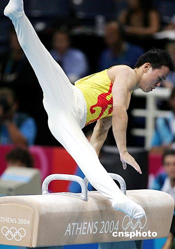 當(dāng)?shù)貢r間八月十六日晚,雅典奧運(yùn)男子體操團(tuán)體比賽在奧運(yùn)體操比賽館舉行,中國隊衛(wèi)冕失利,僅獲得第五名。中新社記者:毛建軍