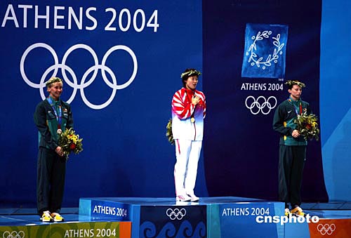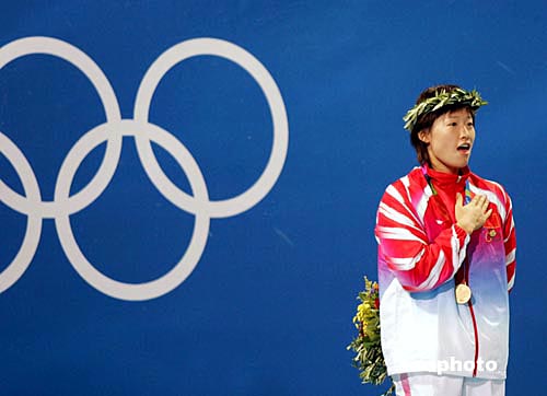 參加雅典奧運會游泳比賽的中國選手極少擁有問鼎獎牌實力者,羅雪娟在當地時間八月十六日晚奇跡般奪得女子一百米蛙泳金牌。這是她登上領獎臺最高層,頭戴橄欖桂冠,面對冉冉升起的中國國旗激動得和唱著國歌。中新社記者:任晨鳴