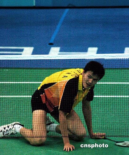 中國羽球選手鮑春來與韓國樸泰相在激烈對抗后均認為自己失手而雙雙長嘆。后裁判認定該球韓國選手勝。最終結果是鮑春來被淘汰。作者:陳佳