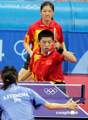 當地時間八月十八日,在雅典奧運會乒乓球女雙1/4決賽中,中國選手郭躍、牛劍鋒以4:2擊敗日本選手福原愛、梅村禮,晉級四強。中新社記者:張煒
