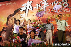 為紀念一代偉人鄧小平同志誕辰一百周年,由中影集團與上海電影集團公司聯合發行的影片《鄧小平·1928》,于八月十九日與北京觀眾見面并舉行首映式。圖為該片導演及主要演員在首映式上與觀眾見面。中新社記者:張勤
