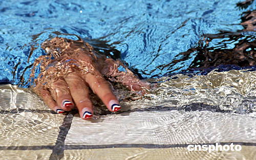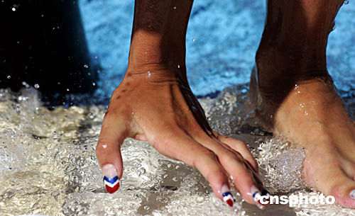 圖為17歲法國選手曼納多在女子800米自由泳比賽中,秀出自己繽紛指甲。她在先前進行的女子400米自由泳比賽中為法國隊贏得了第一枚金牌。