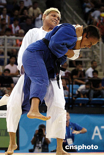圖為在當地時間8月19日舉行的女子次重量級78公斤級柔道比賽中,巴西選手Edinanci Silva將法國選手Celine Lebrun“抱起”的情景。