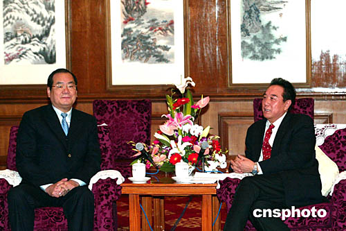 國務院臺灣事務辦公室主任陳云林,一月十日在北京會見由國民黨中央政策會執行長曾永權(圖左)率領的“推動臺商春節包機參訪團”。中新社記者:滿會喬