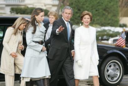1月20日,美國(guó)總統(tǒng)布什和夫人勞拉及其兩個(gè)女兒前往圣約翰大教堂。(美聯(lián)圖)