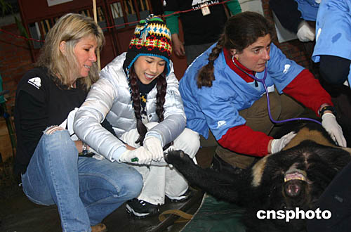 圖為莫文蔚(中)與亞洲動物基金創辦人及行政總監謝羅便臣女士(左一)一起為這頭黑熊做身體檢查。作者:魯彥
