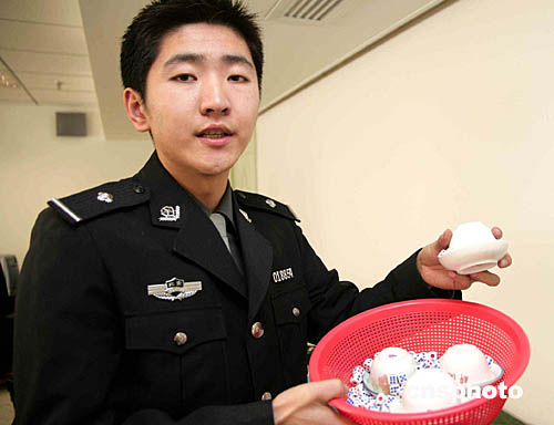 北京警方公布:自去年十二月上旬正式部署查禁賭博專項行動以來,共破獲網絡賭博案件八起,抓獲涉案人員三十六人;還打掉“百家樂”、“六合彩”、“皇帝公司賭”、“扎金花”等傳統聚眾賭博窩點五十七個,抓獲賭博人員六千五百三十九人,收繳賭博資金三百八十六萬余元人民幣。圖為警員展示部分賭具。作者:劉永生
