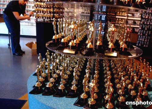 美國洛杉磯當地時間一月二十五日清晨,第七十七屆奧斯卡電影獎提名名單揭曉。圖為好萊塢紀念品店里的奧斯卡獎小金人模型大批上市。作者:賈國榮
