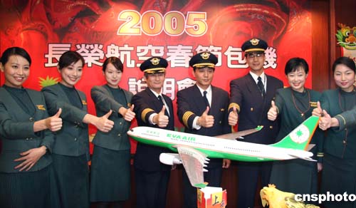 臺(tái)灣長(zhǎng)榮航空公司參加臺(tái)商春節(jié)包機(jī)首航的機(jī)組人員二十七日下午與媒體見(jiàn)面。據(jù)悉,長(zhǎng)榮航空此次將執(zhí)行四個(gè)往返、共八個(gè)航班,往返臺(tái)北——北京、臺(tái)北——上海,時(shí)間分別是一月二十九日、二月七日和二月十五日。作者:邢利宇