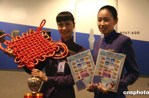 臺灣“華航”為此次首航北京春節包機活動,特別與桃園郵局合作設計了二OO五年“華航兩岸春節包機紀念郵票”。郵票中除了有“相逢自是有緣,華航以客為榮”的空服形象,另有五款“華航”目前機隊機型及此次春節包機航站圖等。它們將作為禮品贈與此次搭乘“華航”春節包機的旅客。作者:邢利宇