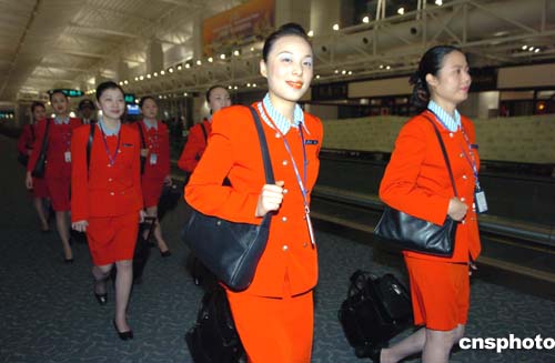 一月二十九日晨,南航廈航臺商春節包機首航儀式在廣州白云國際機場舉行。南航的CZ3097航班和廈航的MF881航班分別于八時、八時十五分滿載臺商從廣州飛往臺北,南航CZ3097航班也成為五十六年來首架降落在臺灣的祖國大陸民航客機。圖為南航空姐靚裝上崗。作者:陳文