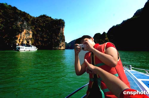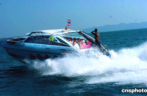 16日的泰國布吉島海面上風平浪靜,游船上的情緒高昂,盡情享受大自然風光。海嘯地震過后,到這里旅游的客人日益增多,當地旅游業正在逐步復蘇。作者:宋吉河
