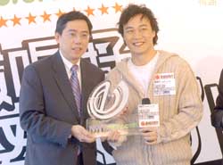 歌星陳奕迅3月4日在香港出席由新城電臺(tái)娛樂(lè)臺(tái)主辦‧主題贊助《新城唱好陳奕迅05’出擊音樂(lè)會(huì)》記者會(huì),音樂(lè)會(huì)贊助商新世界電訊市務(wù)副總裁洪秋偉向陳奕迅頒贈(zèng)記念品以示鼓勵(lì)。音樂(lè)會(huì)將于三月二十七日晚假會(huì)展新翼舉行。作者:鄧慶樂(lè)