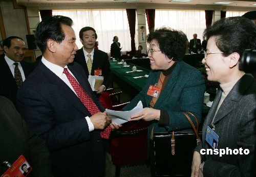 中共中央政治局常委、中紀委書記吳官正三月四日看望參加全國政協十屆三次會議的共青團、青聯、婦聯界委員,并參加聯組會討論。作者:毛建軍