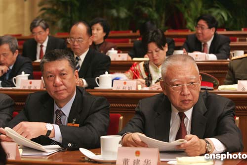 三月五日,十屆全國人大三次會議在北京人民大會堂開幕,香港特首董建華、澳門特首華何厚鏵在主席臺上列席會議,聽取國務院總理溫家寶所做政府工作報告。作者:毛建軍