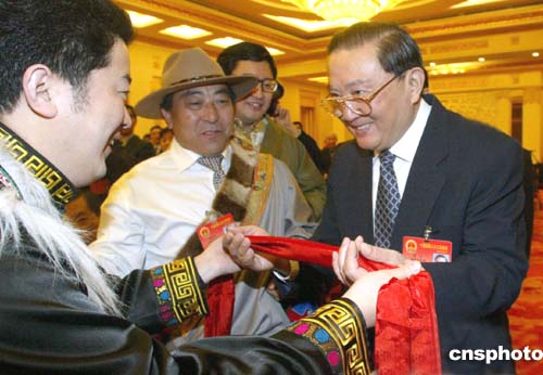 三月十一日,全國人大四川代表團在北京人民大會堂審議全國人大常委會工作報告和“兩高”報告,藏族人大代表為參加審議的中央政法委員會書記羅干獻上象征尊貴的紅色哈達。作者:廖文靜